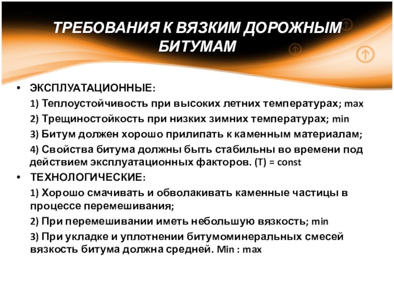 Слайд 21ТРЕБОВАНИЯ К ВЯЗКИМ ДОРОЖНЫМ БИТУМАМ