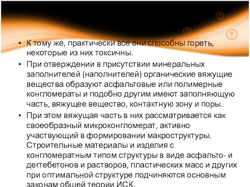 При отверждении в присутствии минеральных заполнителей (наполнителей) органические вяжущие вещества образуют асфальтовые или полимерные конгломераты и подобно другим имеют заполняющую часть, вяжущее вещество, контактную зону и поры.