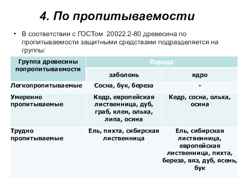В соответствии с ГОСТом 20022.2-80 древесина по пропитываемости защитными