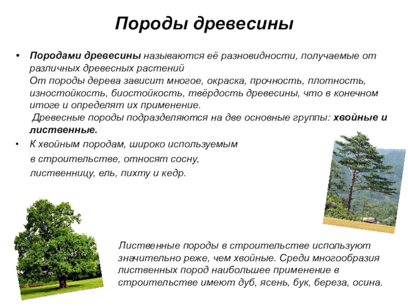Древесные породы подразделяются на две основные группы: хвойные и лиственные.