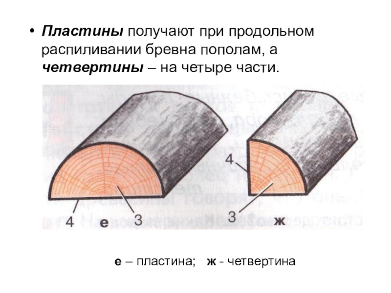 Слайд 15Пластины получают при продольном распиливании бревна пополам, а четвертины – на