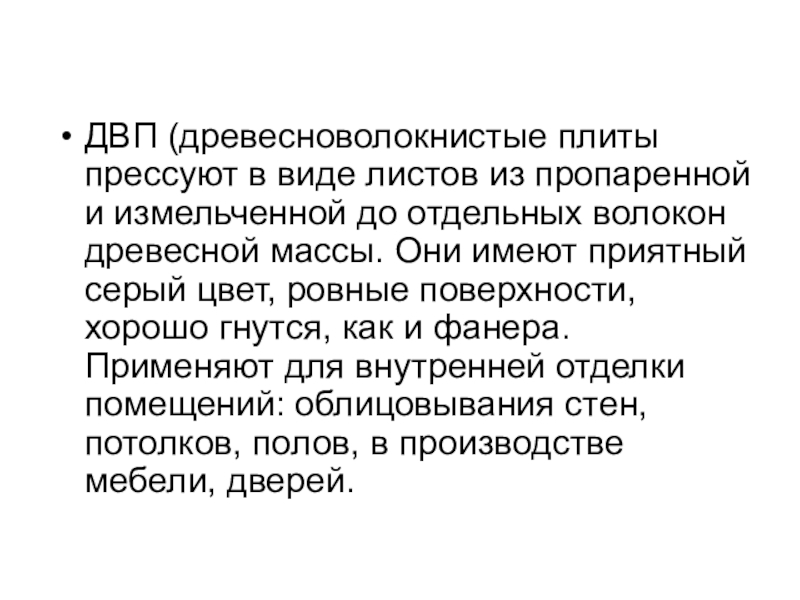 Слайд 24ДВП (древесноволокнистые плиты прессуют в виде листов из пропаренной и измельченной