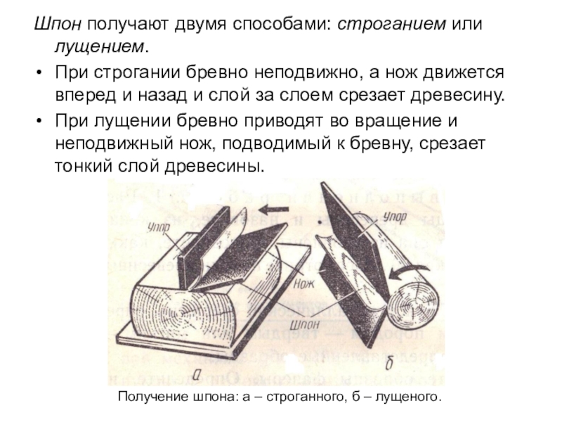 Слайд 20Шпон получают двумя способами: строганием или лущением.