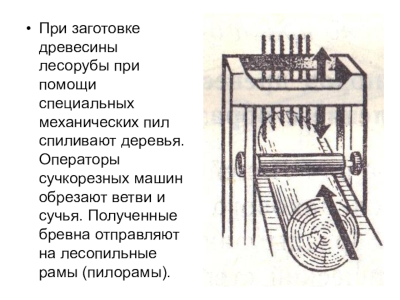 Слайд 10При заготовке древесины лесорубы при помощи специальных механических пил спиливают деревья.