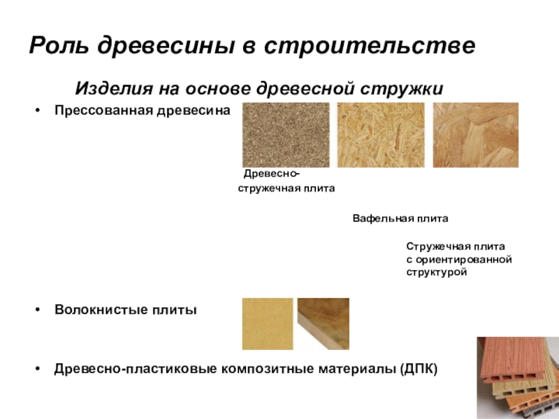 виде стружек, опилок, древесной пыли. Для производства древесностружечных плит используют в основном древесные отходы и даже кору. Они прочны, почти не коробятся, хорошо обрабатываются режущими инструментами. Из них изготавливают мебель, двери, перегородки, стены, полы. Однако с течением времени они выделяют вредные для здоровья вещества, поэтому их нежелательно применять в жилых помещениях.