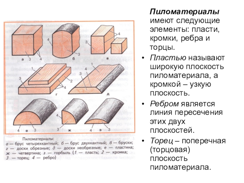 Слайд 17 Пиломатериалы имеют следующие элементы: пласти, кромки, ребра и торцы.