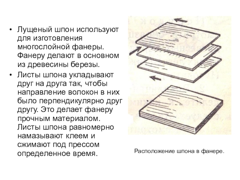Слайд 22Лущеный шпон используют для изготовления многослойной фанеры. Фанеру делают в основном