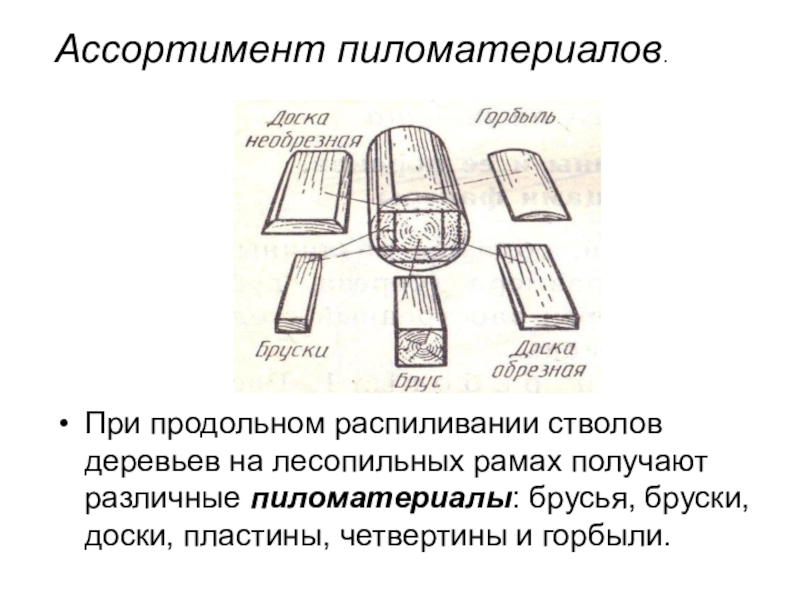 Слайд 11При продольном распиливании стволов деревьев на лесопильных рамах получают различные пиломатериалы:
