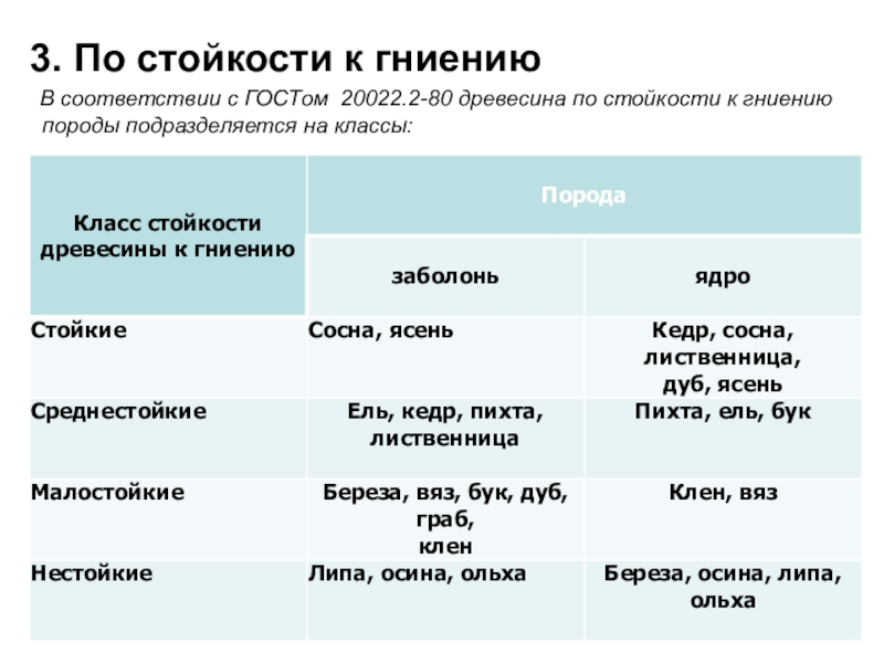 ГОСТом 20022.2-80 древесина по стойкости к гниению породы подразделяется на классы: