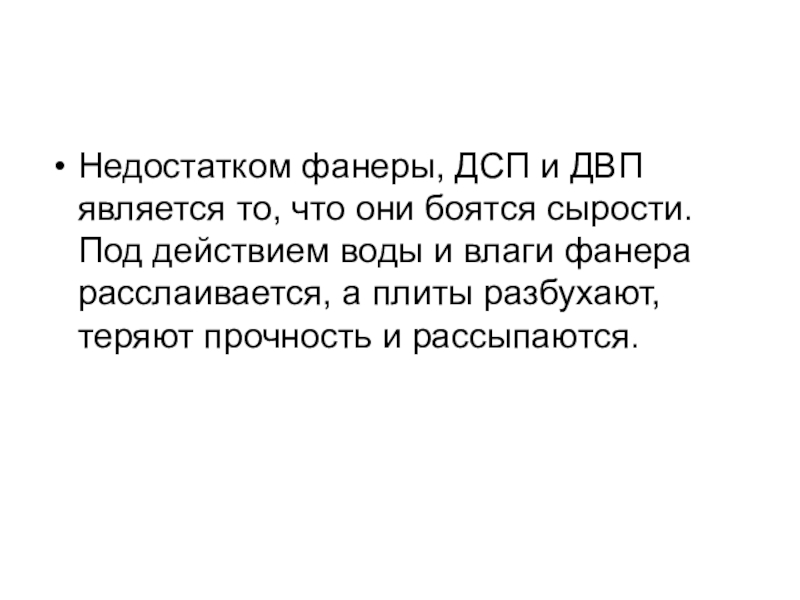 Слайд 25Недостатком фанеры, ДСП и ДВП является то, что они боятся сырости.