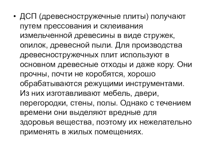 Слайд 23ДСП (древесностружечные плиты) получают путем прессования и склеивания измельченной древесины в
