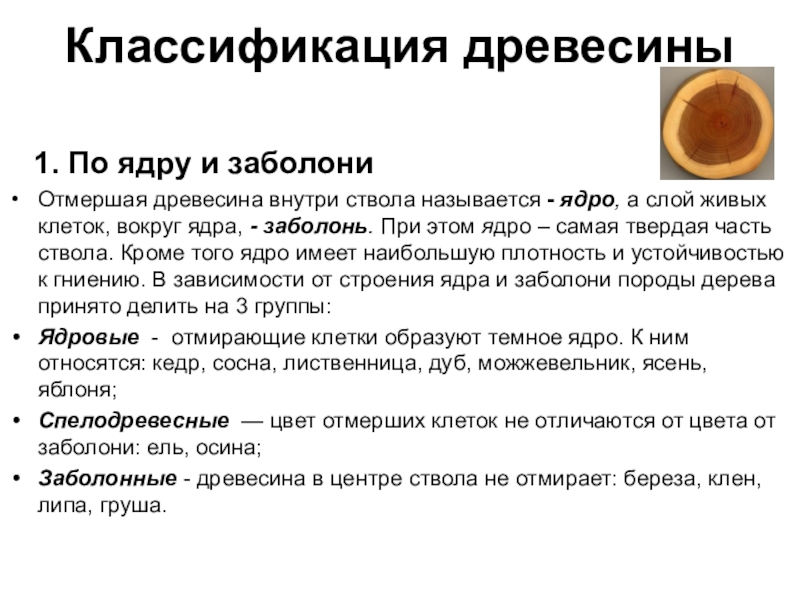 слой живых клеток, вокруг ядра, - заболонь. При этом ядро – самая твердая часть ствола. Кроме того ядро имеет наибольшую плотность и устойчивостью к гниению. В зависимости от строения ядра и заболони породы дерева принято делить на 3 группы: