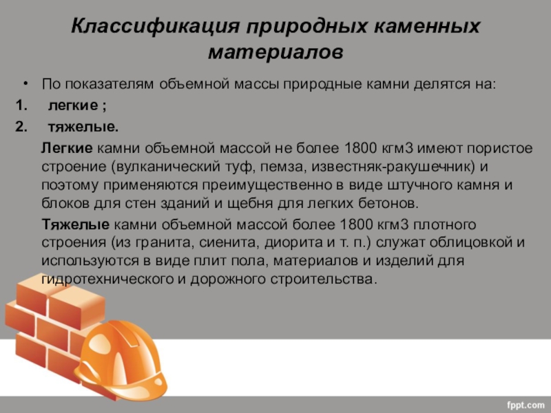 В зависимости от плотности (объёмной массы) каменные материалы разделяют на: