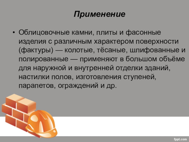 — колотые, тёсаные, шлифованные и полированные — применяют в большом объёме для наружной и внутренней отделки зданий, настилки полов, изготовления ступеней, парапетов, ограждений и др.