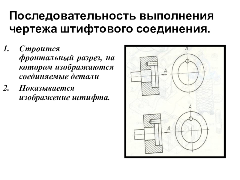 Слайд 15Последовательность выполнения чертежа штифтового соединения.