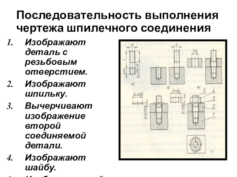 Слайд 9Последовательность выполнения чертежа шпилечного соединения