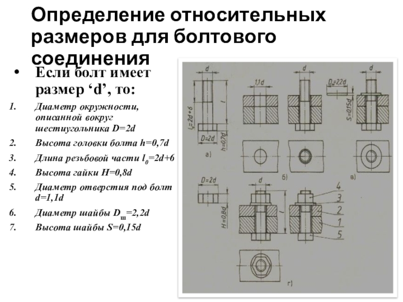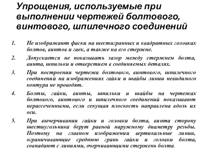 Слайд 10Упрощения, используемые при выполнении чертежей болтового, винтового, шпилечного соединений