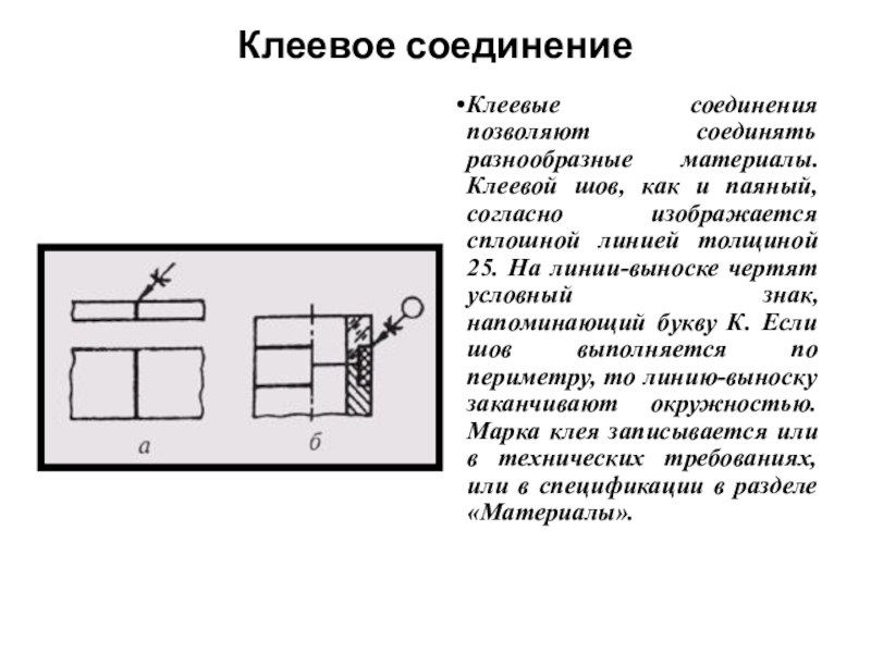 паяный, согласно изображается сплошной линией толщиной 25. На линии-выноске чертят условный знак, напоминающий букву К. Если шов выполняется по периметру, то линию-выноску заканчивают окружностью. Марка клея записывается или в технических требованиях, или в спецификации в разделе «Материалы».