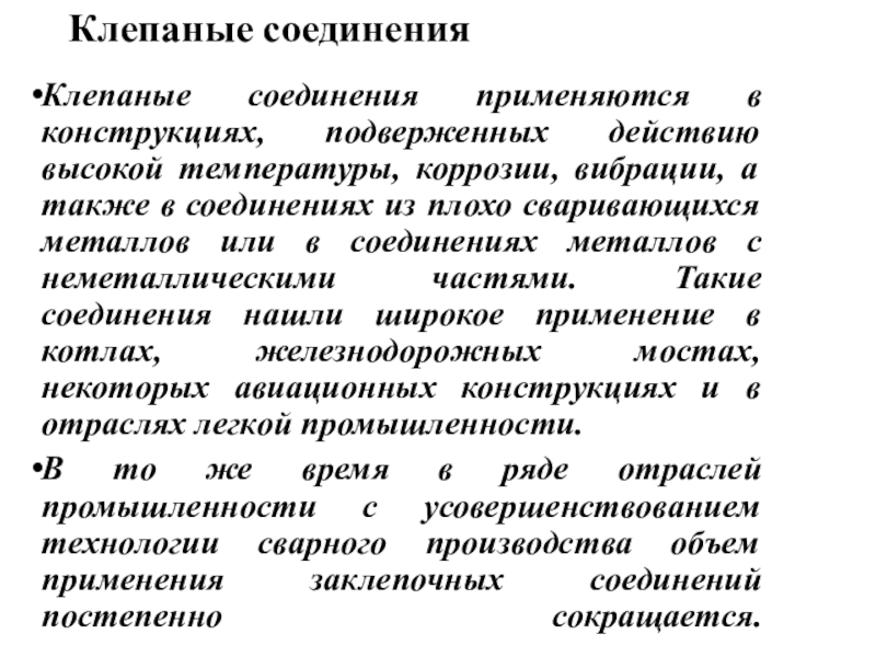 вибрации, а также в соединениях из плохо сваривающихся металлов или в соединениях металлов с неметаллическими частями. Такие соединения нашли широкое применение в котлах, железнодорожных мостах, некоторых авиационных конструкциях и в отраслях легкой промышленности.