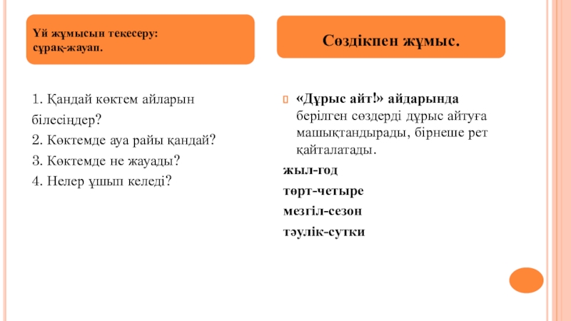 «Дұрыс айт!» айдарында берілген сөздерді дұрыс айтуға машықтандырады, бірнеше рет қайталатады.