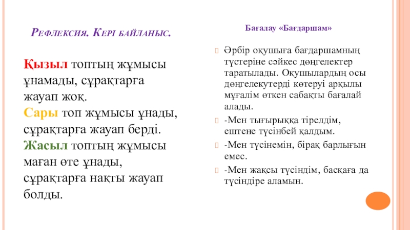 Әрбір оқушыға бағдаршамның түстеріне сәйкес дөңгелектер таратылады. Оқушылардың осы дөңгелекутерді көтеруі арқылы мұғалім өткен сабақты бағалай алады.