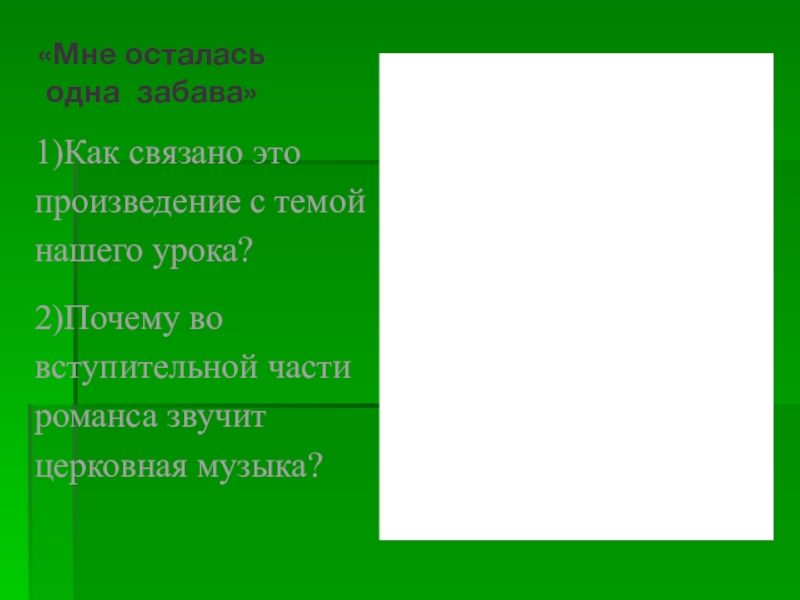 «Мне осталась одна забава»1)Как связано это произведение с темой нашего урока?2)Почему во вступительной части романса звучит церковная