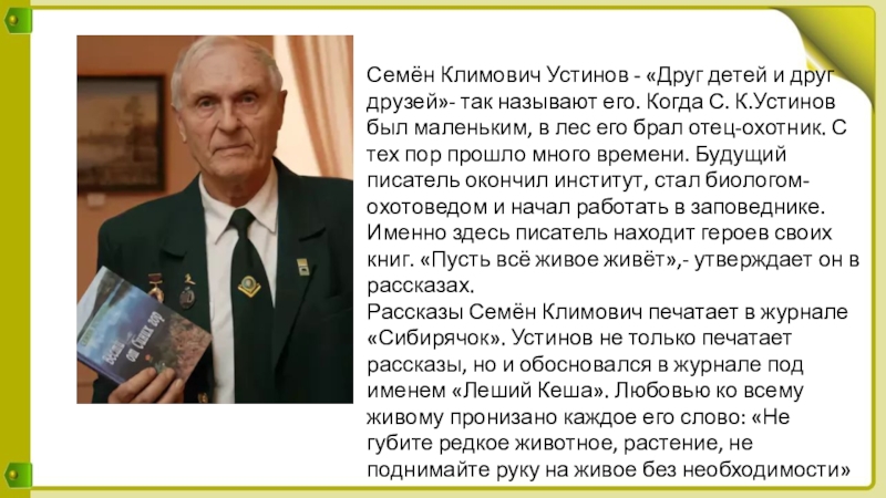 Семён Климович Устинов - «Друг детей и друг друзей»- так называют его. Когда С. К.Устинов был маленьким, в лес его брал отец-охотник. С тех пор прошло много времени. Будущий писатель окончил институт, стал биологом- охотоведом и