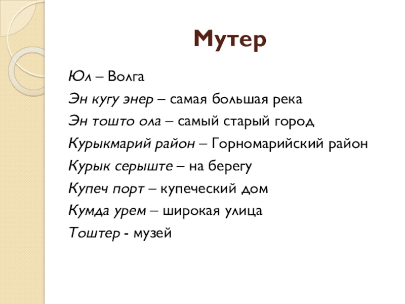 МутерЮл – ВолгаЭн кугу энер – самая большая рекаЭн тошто ола – самый старый городКурыкмарий район – Горномарийский районКурык серыште – на берегуКупеч порт – купеческий домКумда урем – широкая улицаТоштер - музей