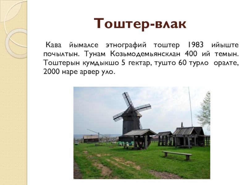 Тоштер-влак	Кава йымалсе этнографий тоштер 1983 ийыште почылтын. Тунам Козьмодемьянсклан 400 ий темын. Тоштерын кумдыкшо 5 гектар, тушто