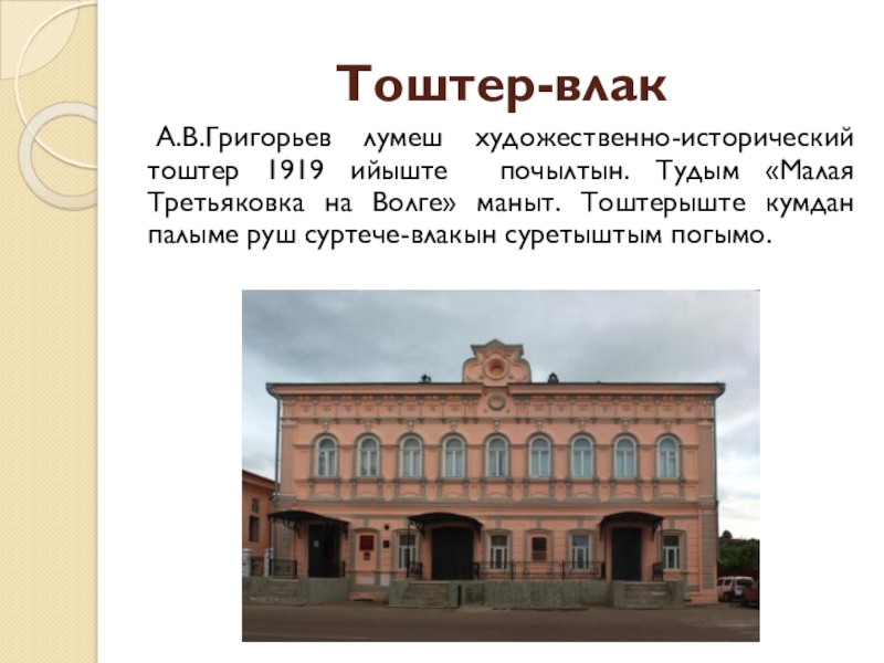 А.В.Григорьев лумеш художественно-исторический тоштер 1919 ийыште почылтын. Тудым «Малая Третьяковка на
