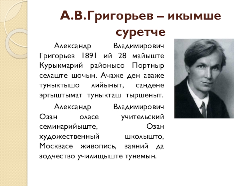 А.В.Григорьев – икымше суретче		Александр Владимирович Григорьев 1891 ий 28 майыште Курыкмарий районысо Портныр селаште шочын. Ачаже ден