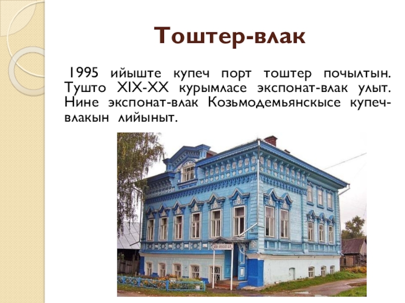 1995 ийыште купеч порт тоштер почылтын. Тушто XIX-XX курымласе экспонат-влак