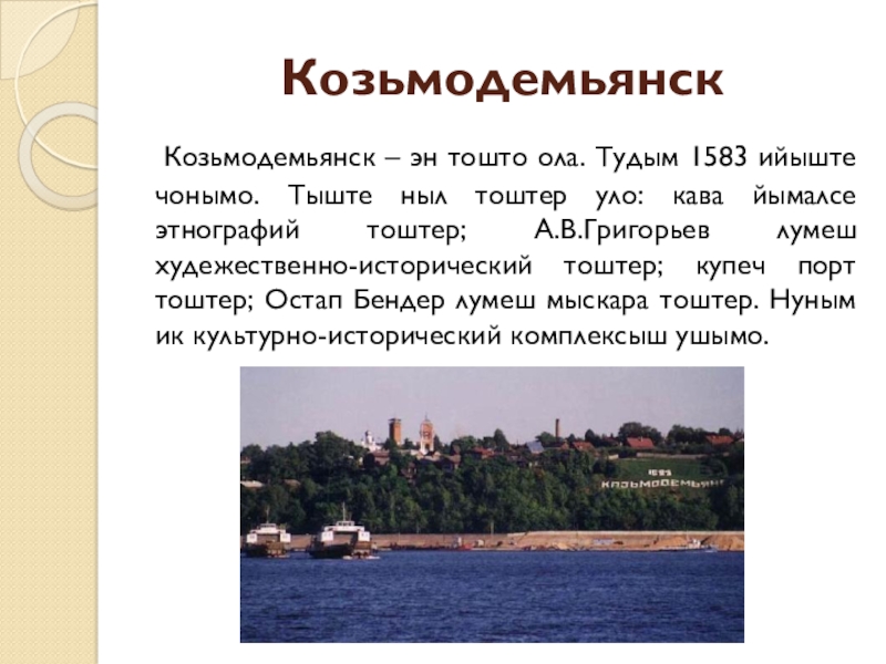Козьмодемьянск – эн тошто ола. Тудым 1583 ийыште чонымо. Тыште ныл
