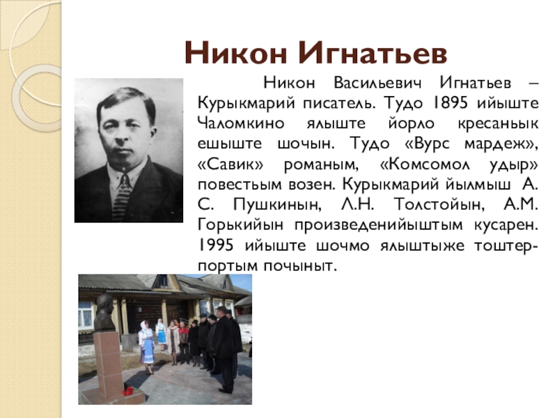 Никон Игнатьев   Никон Васильевич Игнатьев – Курыкмарий писатель. Тудо 1895 ийыште Чаломкино ялыште йорло кресаньык