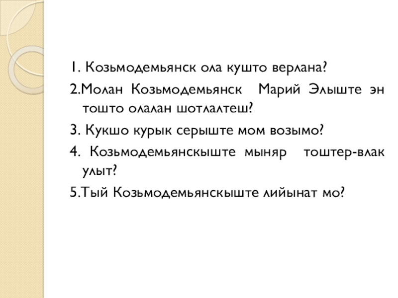 1. Козьмодемьянск ола кушто верлана?2.Молан Козьмодемьянск Марий Элыште эн тошто олалан шотлалтеш?3. Кукшо курык серыште мом возымо?4.