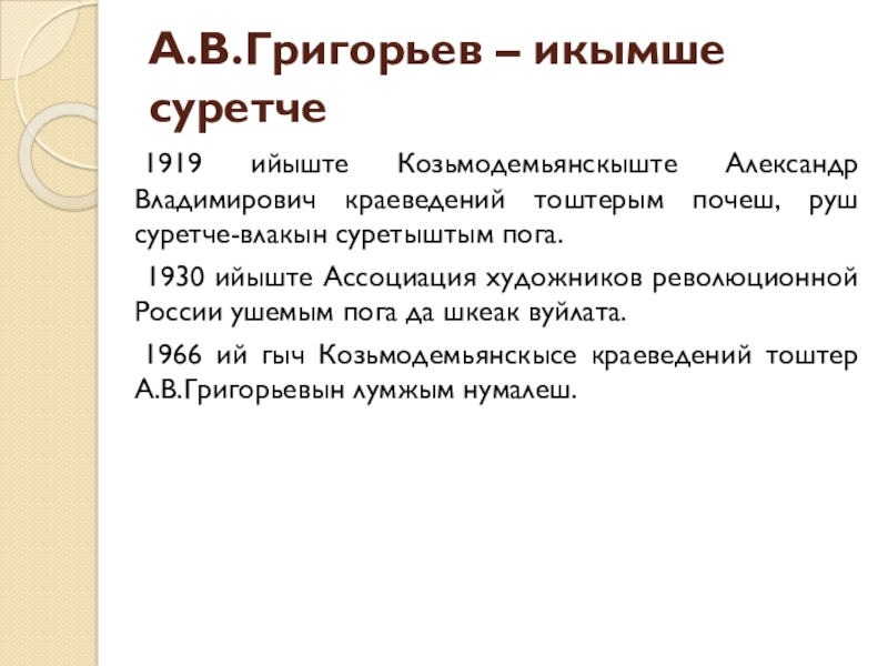 А.В.Григорьев – икымше суретче	1919 ийыште Козьмодемьянскыште Александр Владимирович краеведений тоштерым почеш, руш суретче-влакын суретыштым пога.