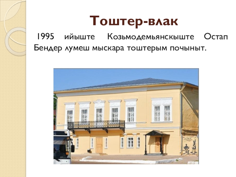 1995 ийыште  Козьмодемьянскыште Остап Бендер лумеш мыскара тоштерым почыныт.