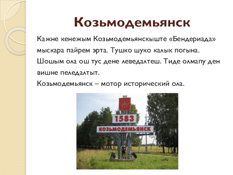 КозьмодемьянскКажне кенежым Козьмодемьянскыште «Бендериада»мыскара пайрем эрта. Тушко шуко калык погына. Шошым ола ош тус дене леведалтеш. Тиде