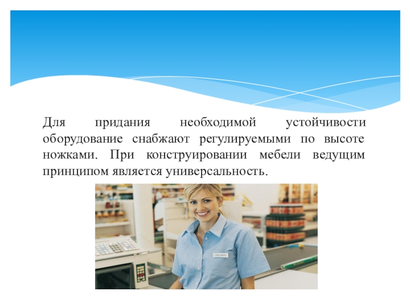 Слайд 58Столы, кассовые кабины и другая оснастка должны иметь возможность регулирования их