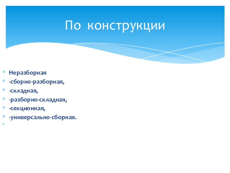 Металлическая, деревянная, комбинированная, с использованием металла, дерева, стекла, пластмасс