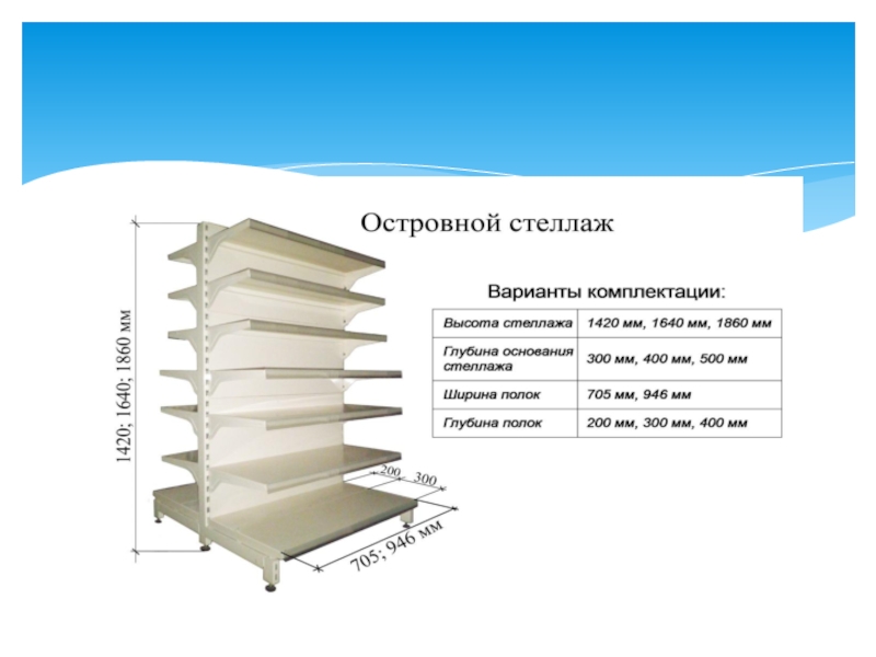 Полки островных горок навешивают с обеих сторон, оптимальная высота горок 1400-1600 мм, но не более 1800 мм вместе с двухсторонним рекламным щитом наверху. Устанавливаются островные горки в центре торгового зала.