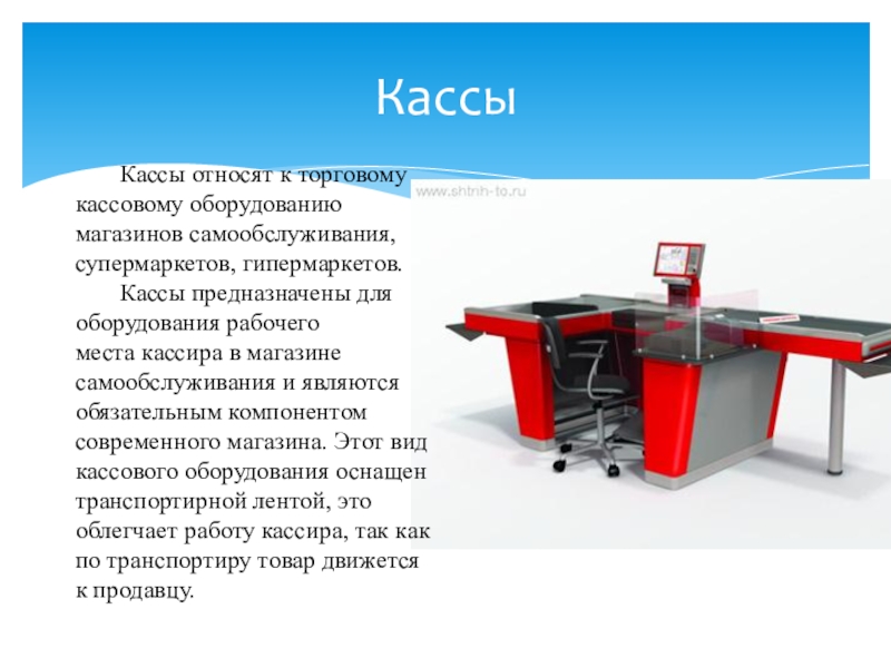 Кассы относят к торговому кассовому оборудованию магазинов самообслуживания, супермаркетов, гипермаркетов. Кассы предназначены