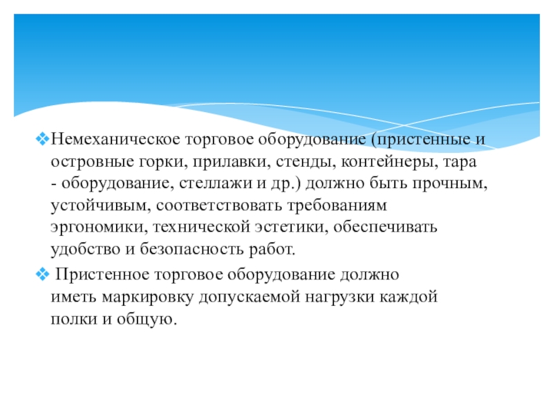Слайд 55Торгово - технологическое оборудование (далее именуется оборудование) должно быть безопасным для работников