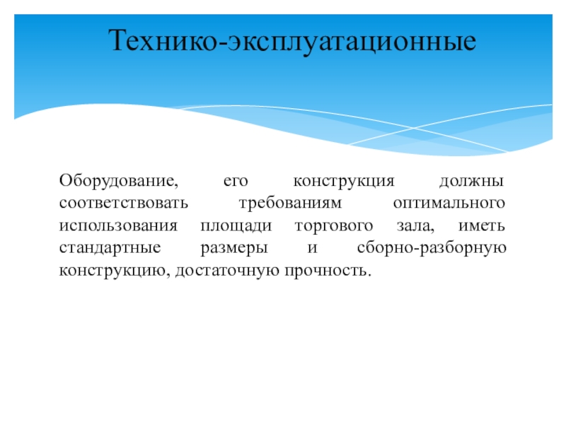 Слайд 46Оборудование, его конструкция должны соответствовать требованиям оптимального использования площади торгового зала,