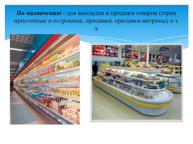Слайд 6По назначению - для выкладки и продажи товаров (горки пристенные и