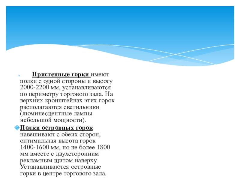 устанавливаются по периметру торгового зала. На верхних кронштейнах этих горок располагаются светильники (люминесцентные лампы небольшой мощности).