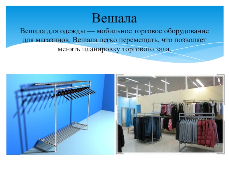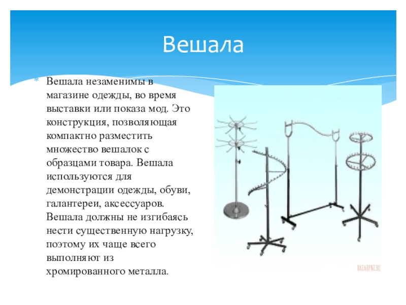 Это конструкция, позволяющая компактно разместить множество вешалок с образцами товара. Вешала используются для демонстрации одежды, обуви, галантереи, аксессуаров. Вешала должны не изгибаясь нести существенную нагрузку, поэтому их чаще всего выполняют из хромированного металла.