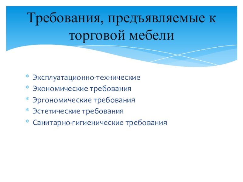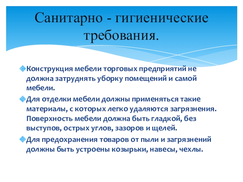 Слайд 54Конструкция мебели торговых предприятий не должна затруднять уборку помещений и самой