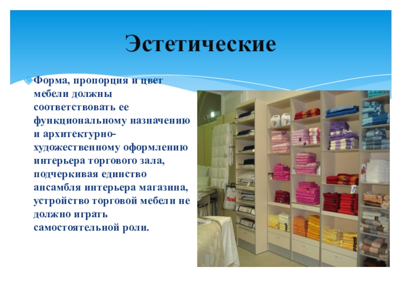 архитектурно-художественному оформлению интерьера торгового зала, подчеркивая единство ансамбля интерьера магазина, устройство торговой мебели не должно играть самостоятельной роли.