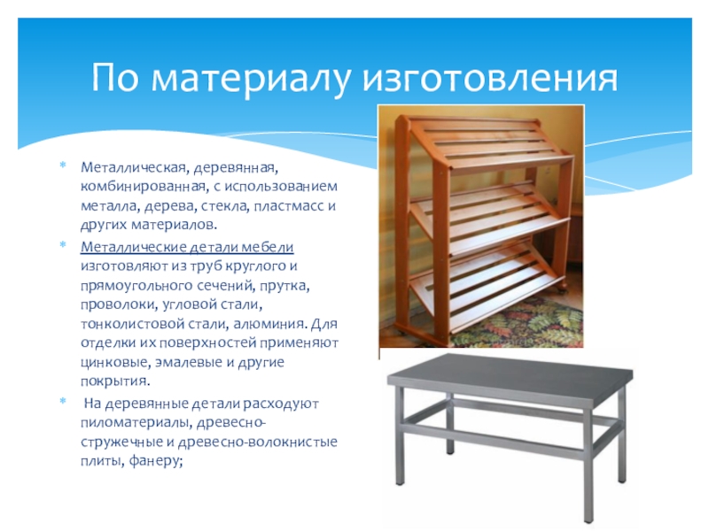 Металлические детали мебели изготовляют из труб круглого и прямоугольного сечений, прутка, проволоки, угловой стали, тонколистовой стали, алюминия. Для отделки их поверхностей применяют цинковые, эмалевые и другие покрытия.
